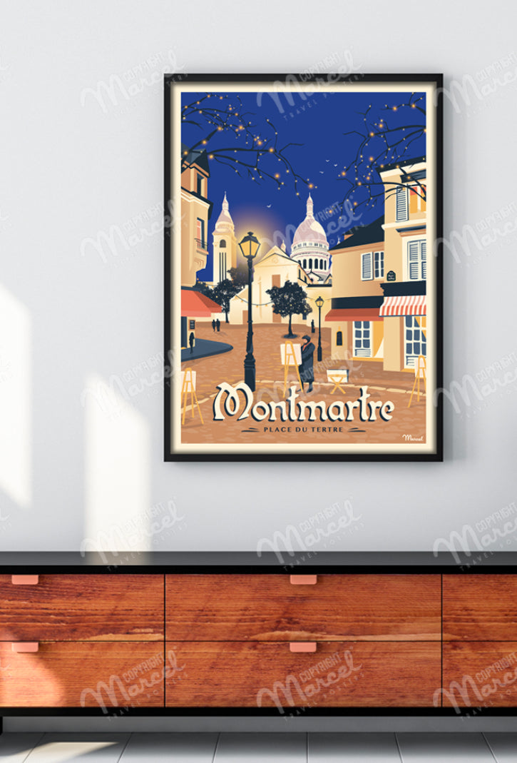 Située sur la butte Montmartre, Marcel vous emmène Place du Tertre, à quelques mètres de la basilique du Sacré Coeur, célèbre dans le monde entier pour ses artistes peintres et ses terrasses. Flânez la nuit à la rencontre de ces artistes grâce au poster MONTMARTRE « Place du Tertre ».
