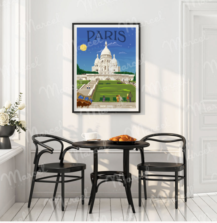 Situé sur les hauteurs de Paris, Marcel vous invite à flâner dans l'atmosphère bohème et animée du quartier emblématique de Montmartre. Ressentez la magie de la capitale, entre artistes de rue et petits cafés typiques, tout en admirant l'architecture majestueuse de la basilique grâce à notre poster PARIS "Sacré-Cœur".