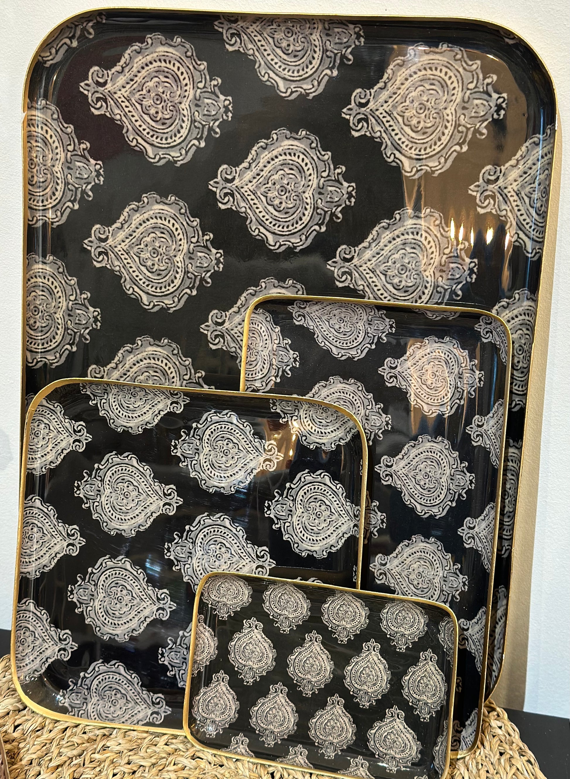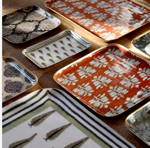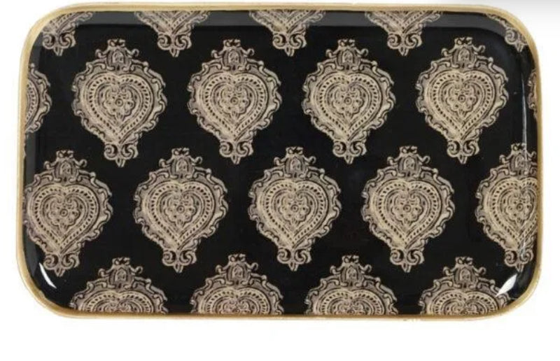 Plateau métal émaillé avec bordure dorée peinte à la main . Vide-poche, plateau de service ou objet deco, il accueillera une tasse à thé ou espresso, une jolie bougie ou sera sera tout simplement superbe en deco sur une table basse. Il apportera une touche vintage élégante et chic à votre intérieur